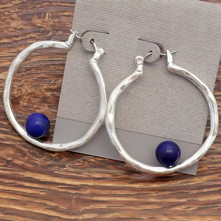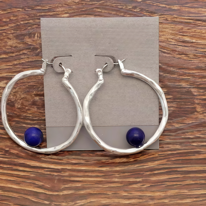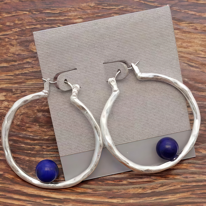 Step into the enchanting realm of bohemian style with these exquisitely handmade silver hoop earrings, featuring a striking lapis lazuli accent. Each earring showcases a textured silver hoop, with a vibrant lapis lazuli bead nestled within. The deep blue hues of the lapis lazuli beautifully complement the silver's lustrous finish, creating a piece that's both artistic and steeped in bohemian charm. Perfect for women who love unique, handcrafted jewelry, these earrings are Ideal for adding a touch of bohemian elegance to any outfit. Whether you're heading to a music festival, a casual outdoor gathering, or simply want to elevate your daily look, these earrings are sure to become a beloved accessory.