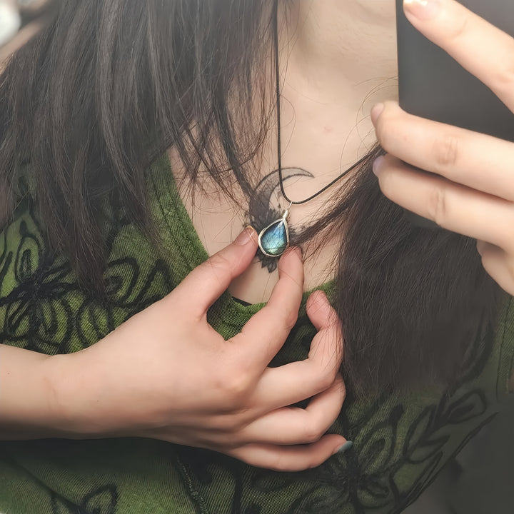 Unique Bohemian Design: The handcrafted silver wire wrapped around the labradorite pendant creates a unique bohemian aesthetic. It not only highlights the natural beauty of the gemstone but also adds a rustic, artistic touch. This versatile design complements casual outfits like a simple white T-shirt and jeans, but also more formal or bohemian-inspired dresses.