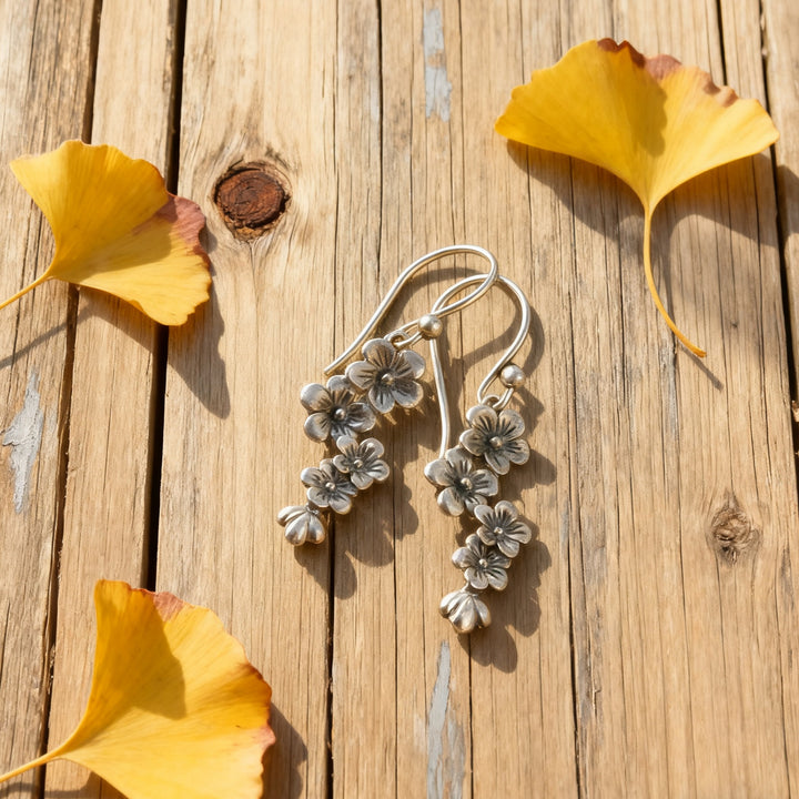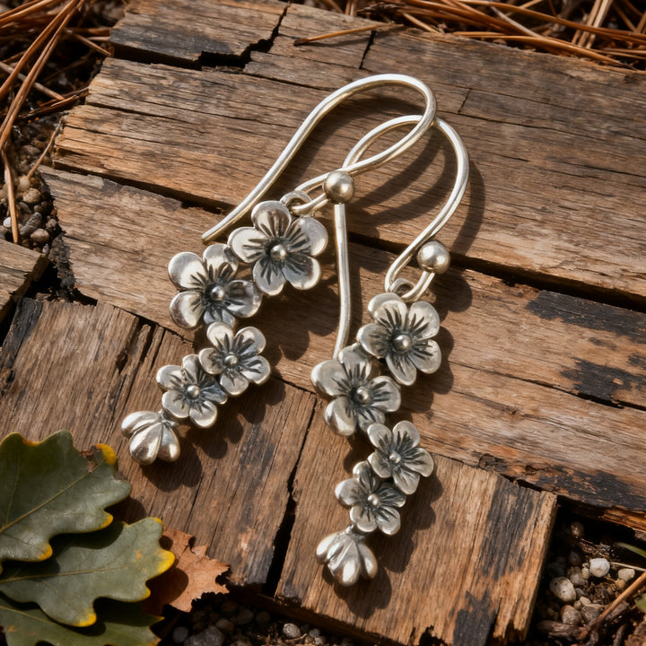 Handmade Bohemian Sterling Silver Floral Dangle Earrings with Cherry Blossom Design
