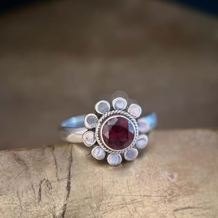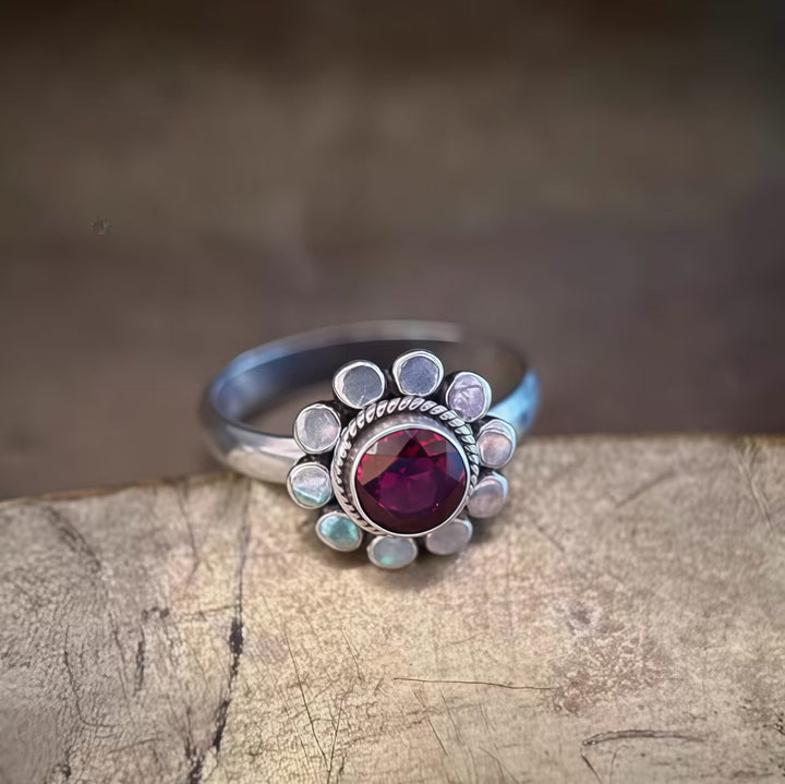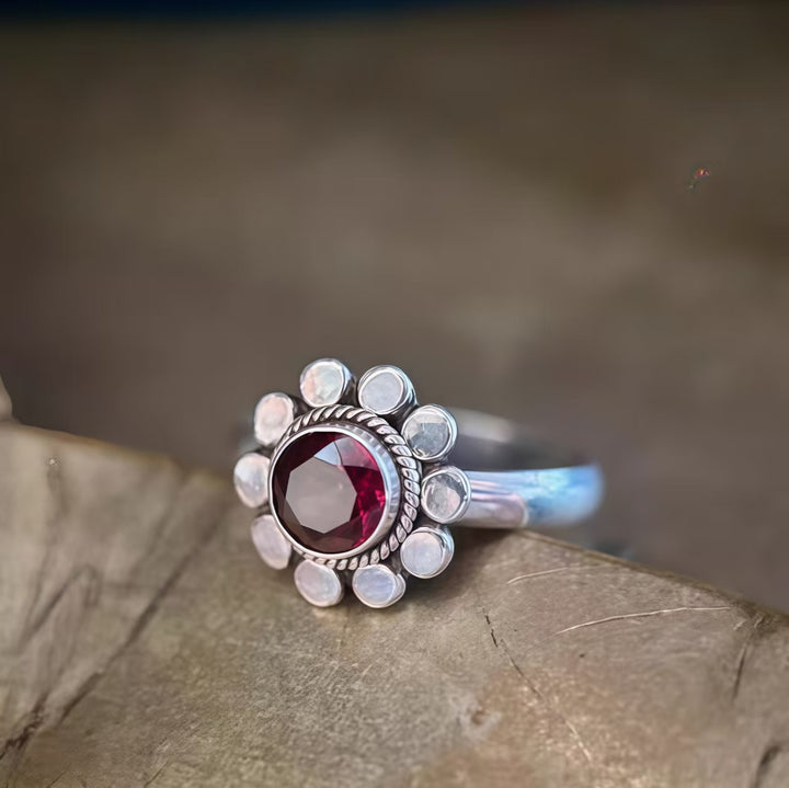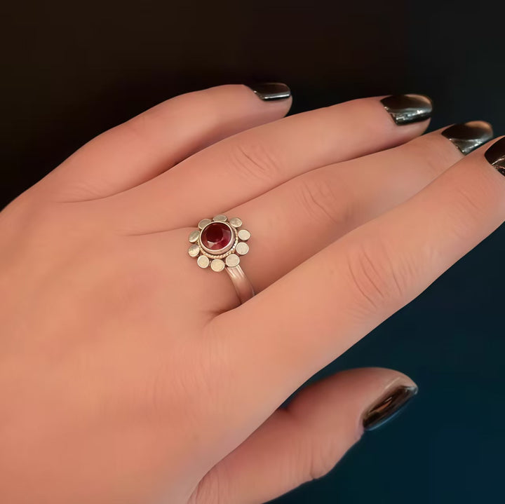 Handmade Bohemian Style 925 Sterling Silver Garnet Flower Design Women's Ring