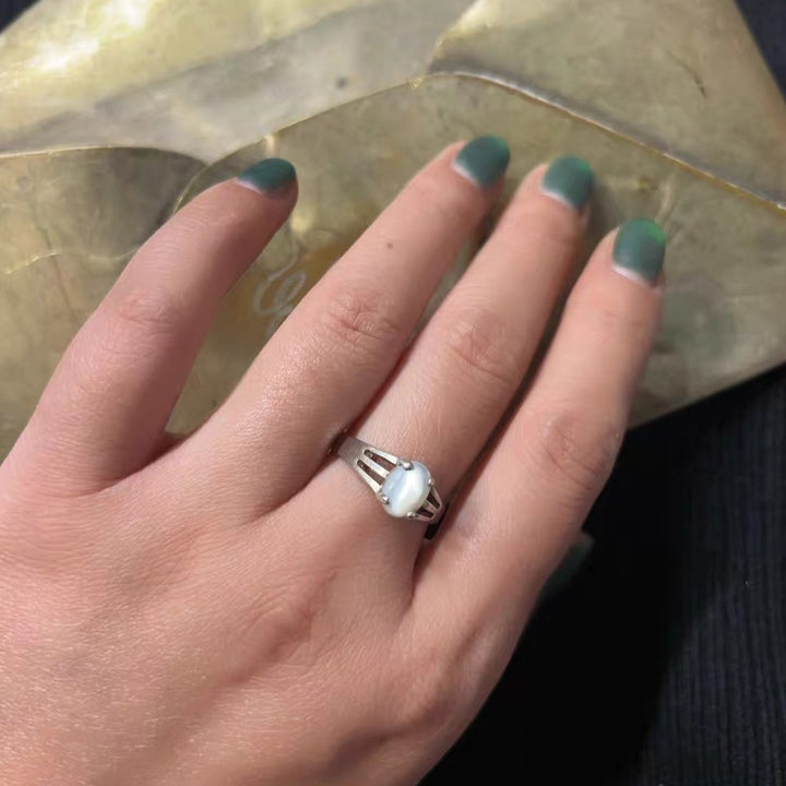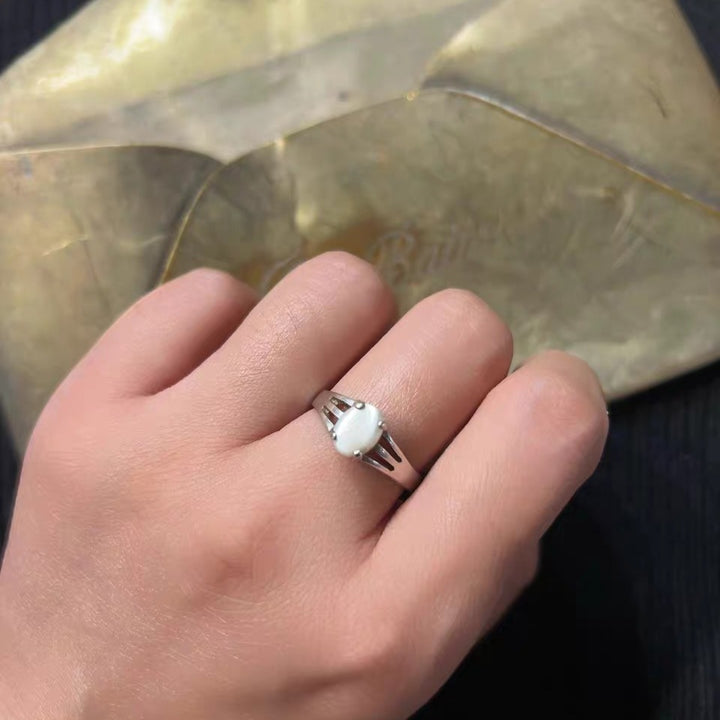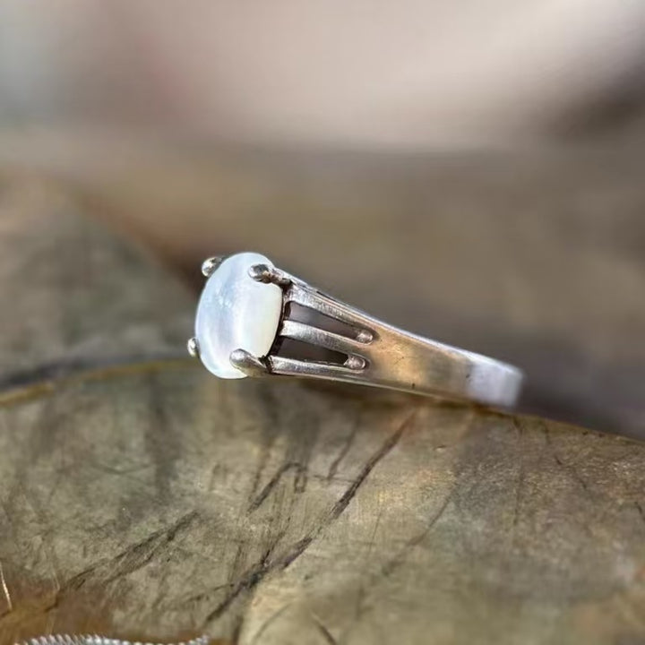 Oval Mother of Pearl Artistic Design: The mother of pearl, set in a polished silver band with an open-shank design, creates a visually delicate look. Its subtle iridescence adds depth and allure, making this ring both a stylish and symbolic piece that complements bohemian, casual, or elegant outfits.