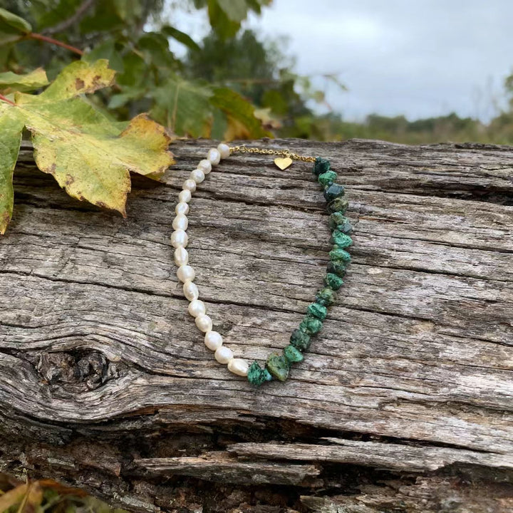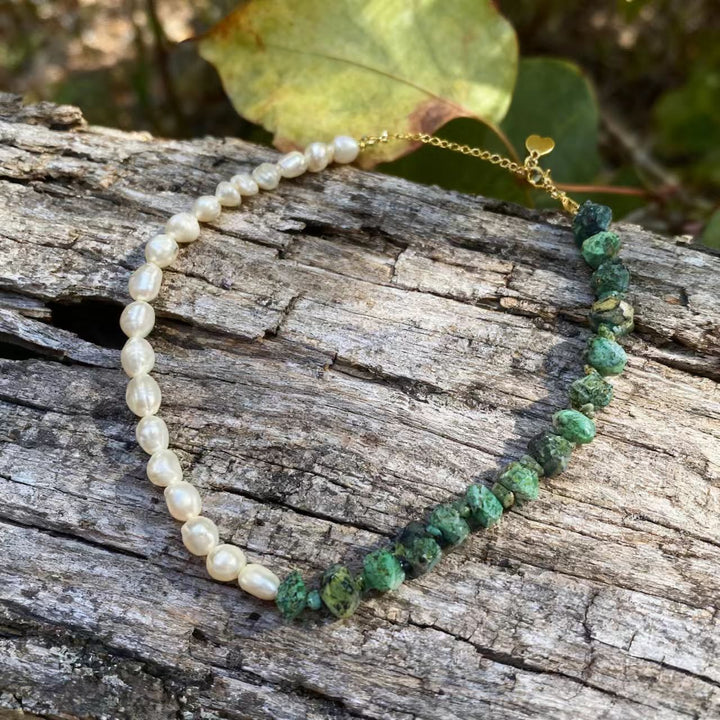Dive into the enchanting world of bohemian fashion with this exquisitely handmade necklace. Expertly crafted, it marries the classic elegance of baroque pearls with the earthy allure of irregular natural amazonite stones, all strung along a durable titanium steel chain. The delicate gold - toned heart - shaped charm on the extender chain adds a sprinkle of romance. Tailored for American women who have a penchant for unique, artisanal jewelry, this necklace is the perfect piece to bring a touch of free - spirited sophistication to any outfit. Whether you're heading to a beach bonfire, a music festival, or just jazzing up your daily look, it's bound to become a staple in your jewelry collection.