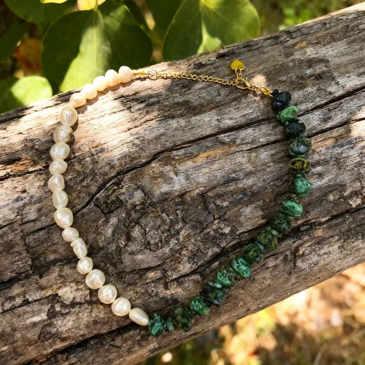 Handmade Bohemian - Style Titanium Steel Necklace with Baroque Pearls and Irregular Amazonite
