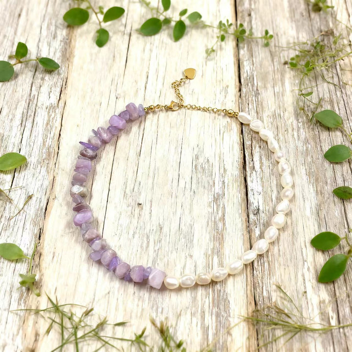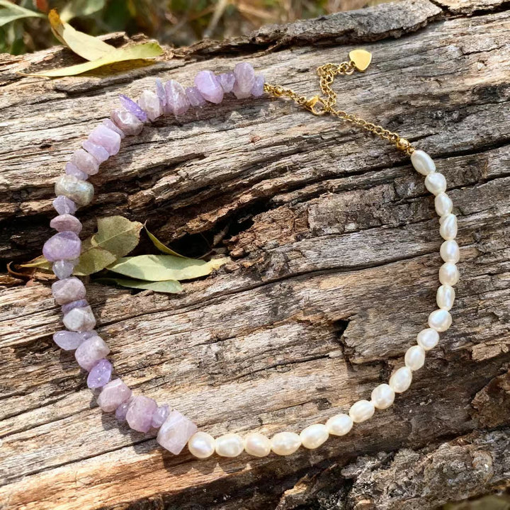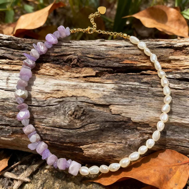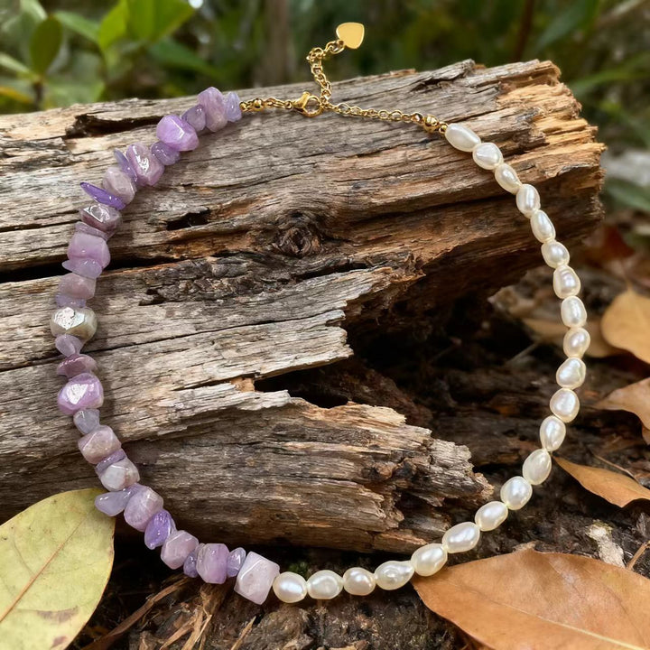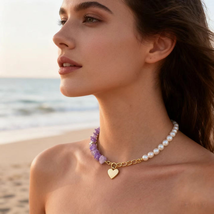 Embrace the free - spirited charm of bohemian fashion with this exquisitely handmade necklace. Skillfully crafted, it combines the timeless elegance of baroque pearls with the mystical allure of natural irregular crystal stones. Strung on a durable titanium steel chain, and featuring a delicate gold - toned heart - shaped charm on the extender, this necklace is a statement piece for American women who love unique, artisanal jewelry. Whether you're heading to a music festival, a casual gathering, or want to elevate your everyday look, it adds a touch of whimsy and sophistication.