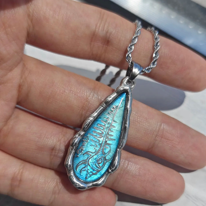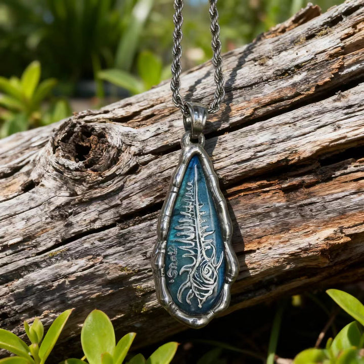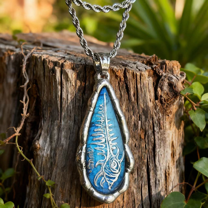 Embrace the bohemian spirit with this exquisitely handmade necklace, a true testament to unique craftsmanship. The necklace features a sturdy titanium steel chain that gracefully suspends a pendant, which is the centerpiece of this piece. Inside the pendant, a vibrant blue - toned labradorite is complemented by a hand - painted design on eco - friendly tin foil, depicting an intricate feather pattern. This combination creates a captivating visual effect, blending the natural iridescence of the labradorite with the artisanal charm of the hand - painted element. Ideal for American women who love distinctive, artisanal jewelry, this necklace is perfect for adding a touch of bohemian elegance to any outfit, whether you're heading to a music festival, a casual outdoor gathering, or simply enhance your daily look.