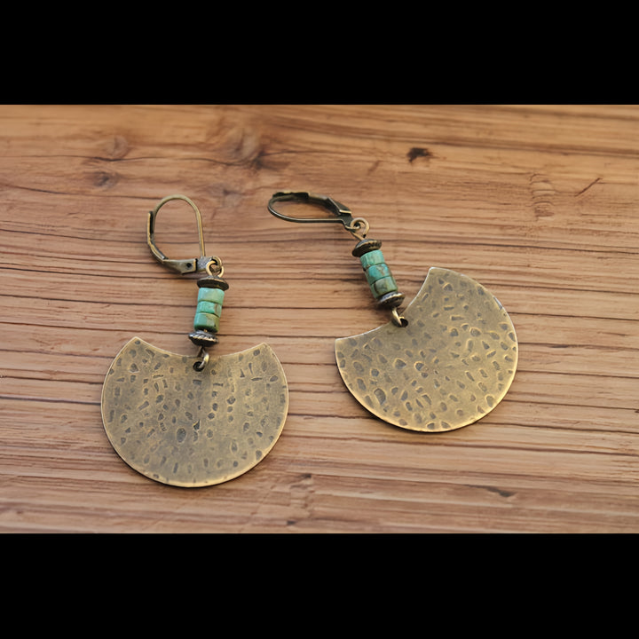 Dive into the enchanting world of bohemian fashion with these meticulously handmade vintage - style copper earrings. Each pair features uniquely textured copper semi - circles, exuding a rustic charm that's perfectly complemented by the vibrant turquoise beads. Ideal for the free - spirited American woman who appreciates one - of - a - kind jewelry pieces, these earrings effortlessly blend retro allure with boho chic. Whether you're attending a music festival, a casual brunch, or simply want to elevate your everyday look, these earrings are the perfect accessory to express your individuality.