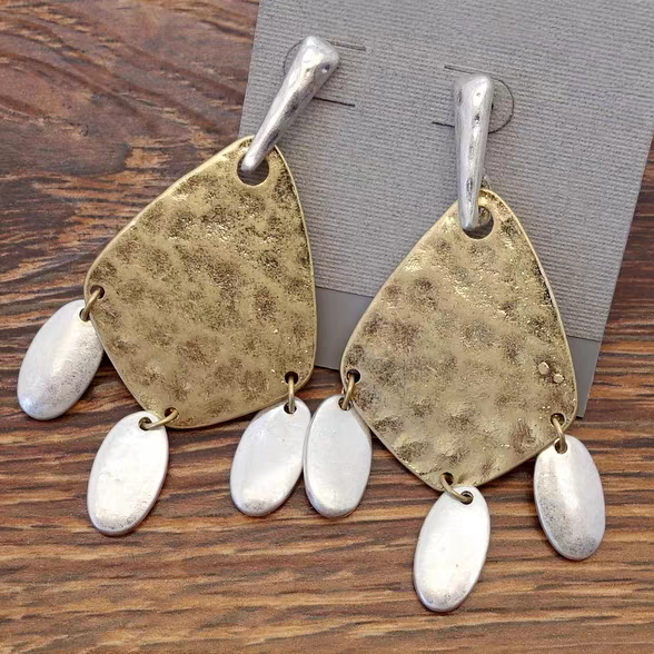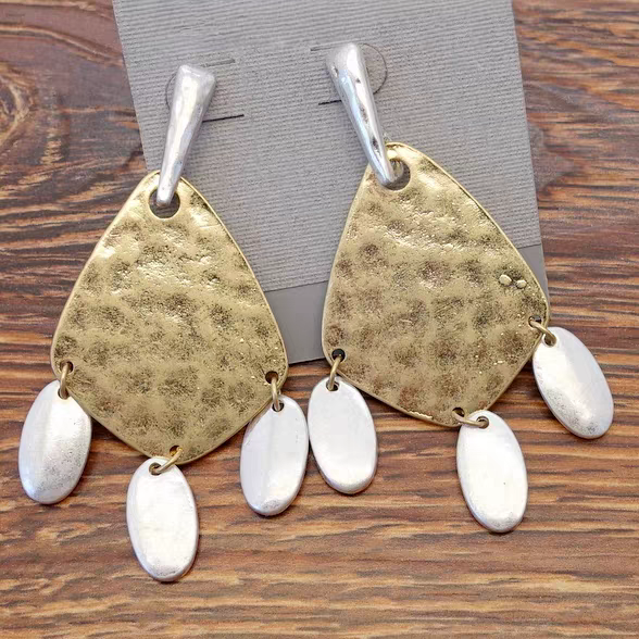 Elevate your style with these exquisite handmade hammered metal statement earrings! Each pair is carefully crafted by skilled artisans, featuring a unique texture created through traditional hammering techniques. The striking combination of gold and silver tones, enhanced with playful dangling accents, makes these earrings a true boho chic accessory. Perfect for casual outings, special events, or adding a touch of artisanal elegance to your daily look.