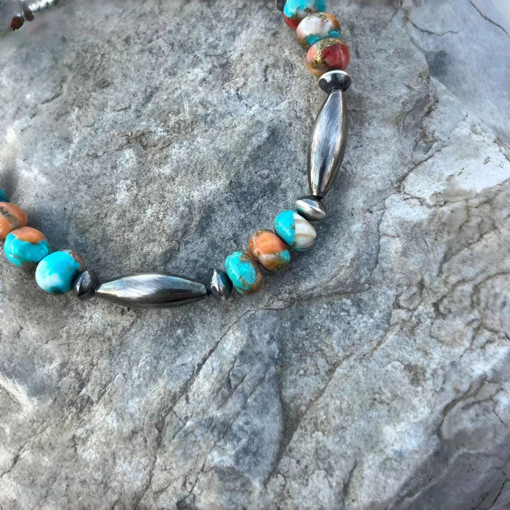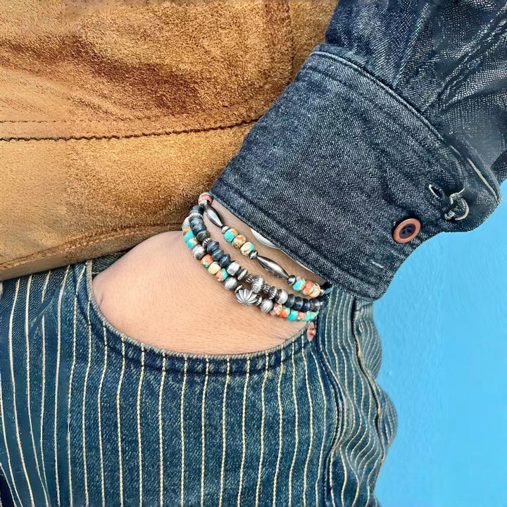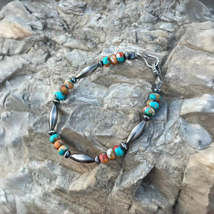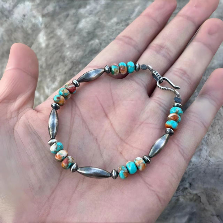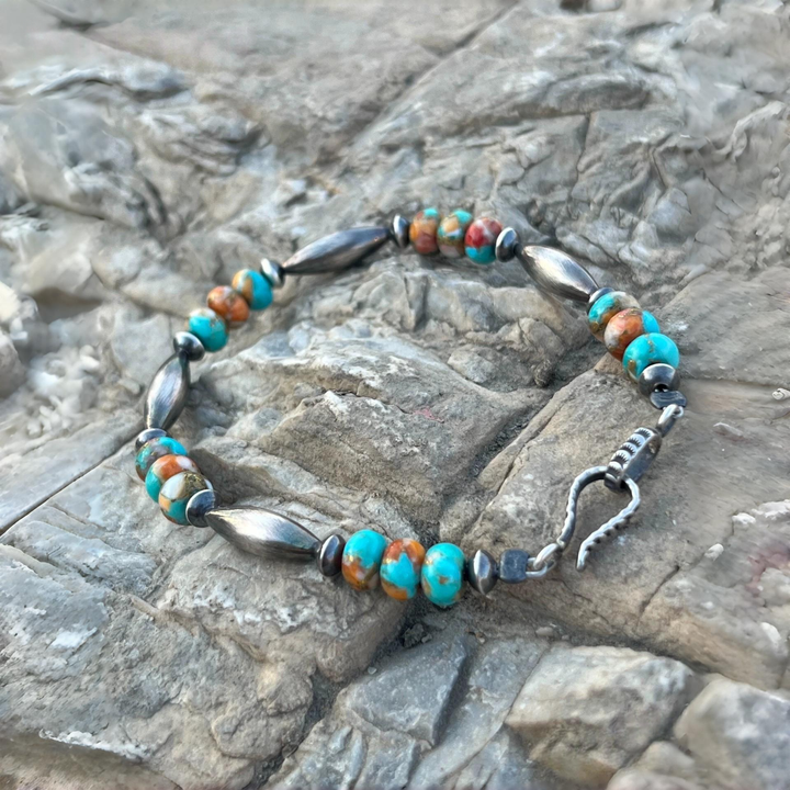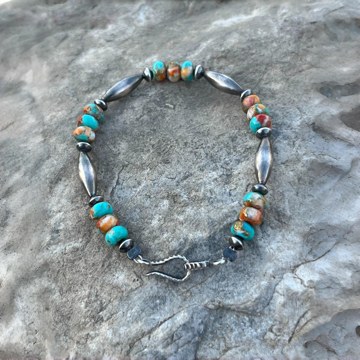 Elevate your jewelry collection with this exquisitely handmade Navajo-style bracelet! Featuring vibrant Mohave turquoise beads, renowned for their rich color and unique patterns, paired with meticulously crafted sterling silver beads that embody the authentic spirit of Navajo artistry. Each piece is lovingly handcrafted, ensuring you receive a one-of-a-kind accessory that pays homage to American heritage. Perfect for adding a touch of Native Southwest charm to your everyday look or as a special gift for those who appreciate handcrafted, culturally inspired jewelry.