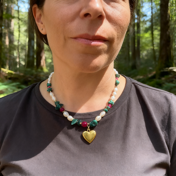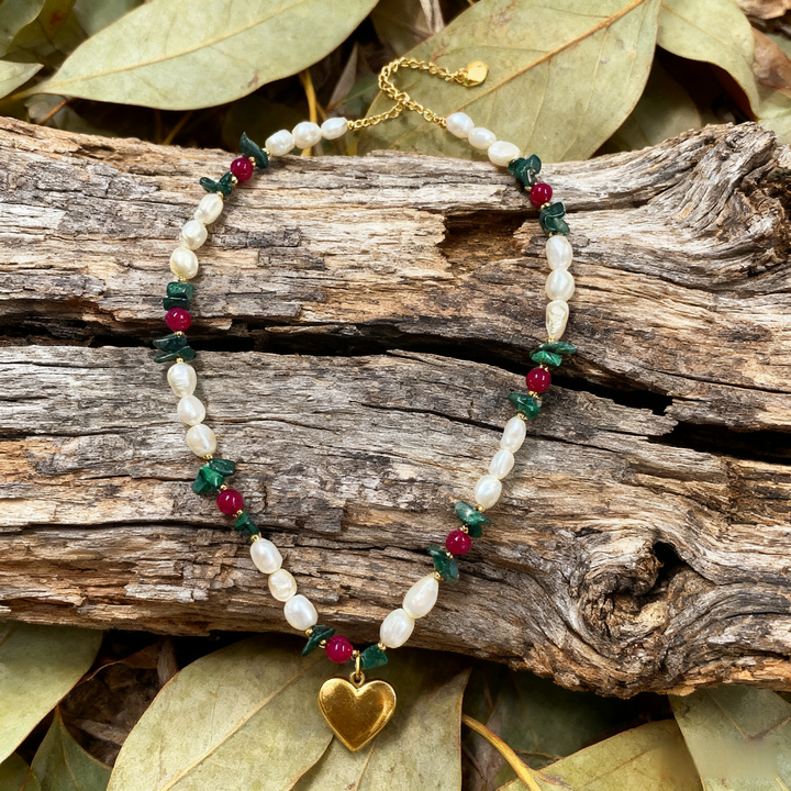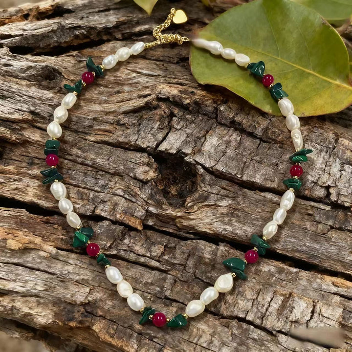 Luxurious Gemstone Combination: The necklace features lustrous pearls, known for their elegance and timeless appeal, paired with the calming beauty of jade and the bold, rich color of rubies. This combination creates a visually striking and sophisticated look.