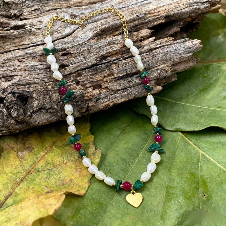 Handmade Pearl, Jade and Ruby Titanium Steel Necklace for Women