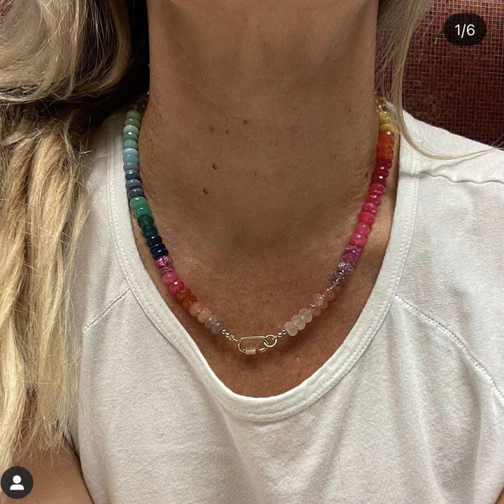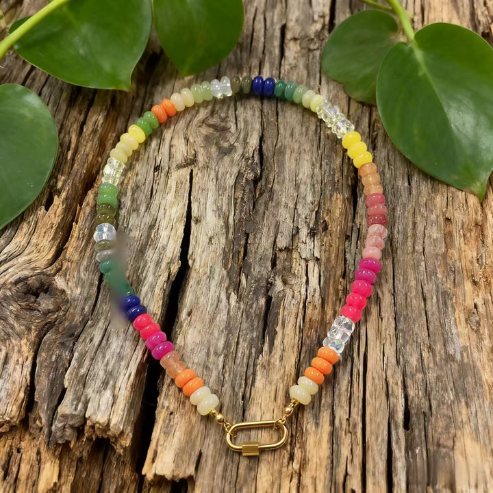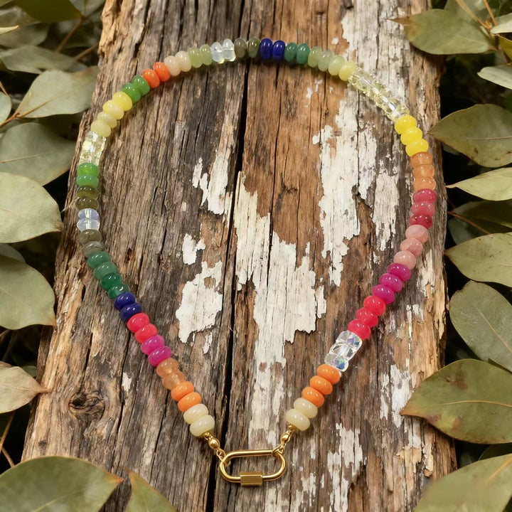 Rainbow - Hued Natural Stones: The necklace features a variety of natural stones in a spectrum of colors, creating a visually striking and dynamic look. Each stone has its own unique texture, color variations, and energy, making every necklace distinct.