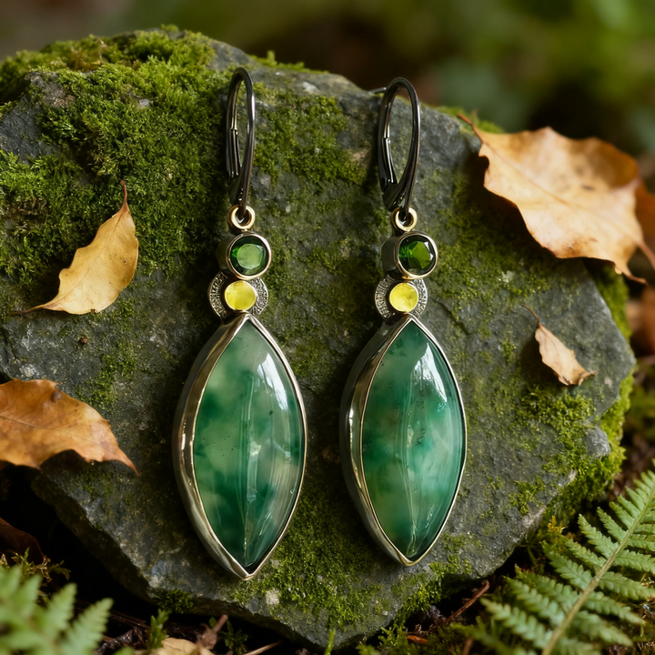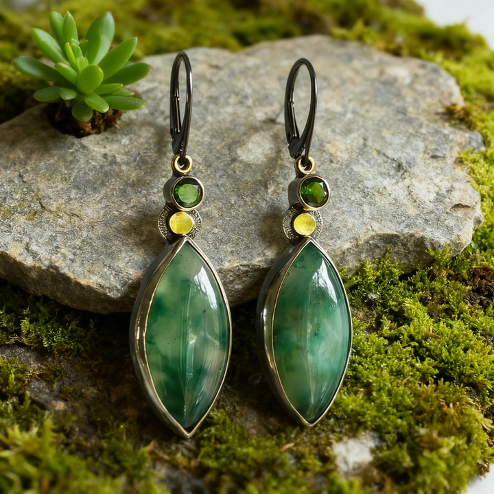 Additional Gemstone Accents: The smaller green and yellow gemstones above the jade add an extra layer of visual interest, creating a harmonious color palette that makes these earrings stand out.