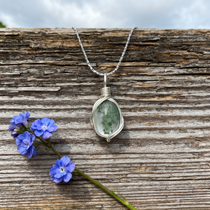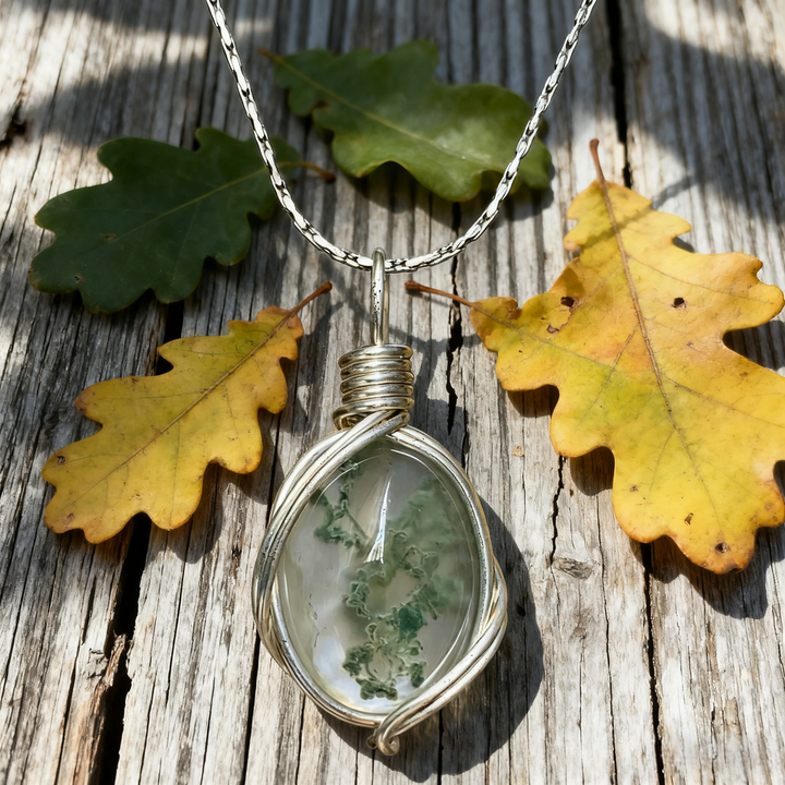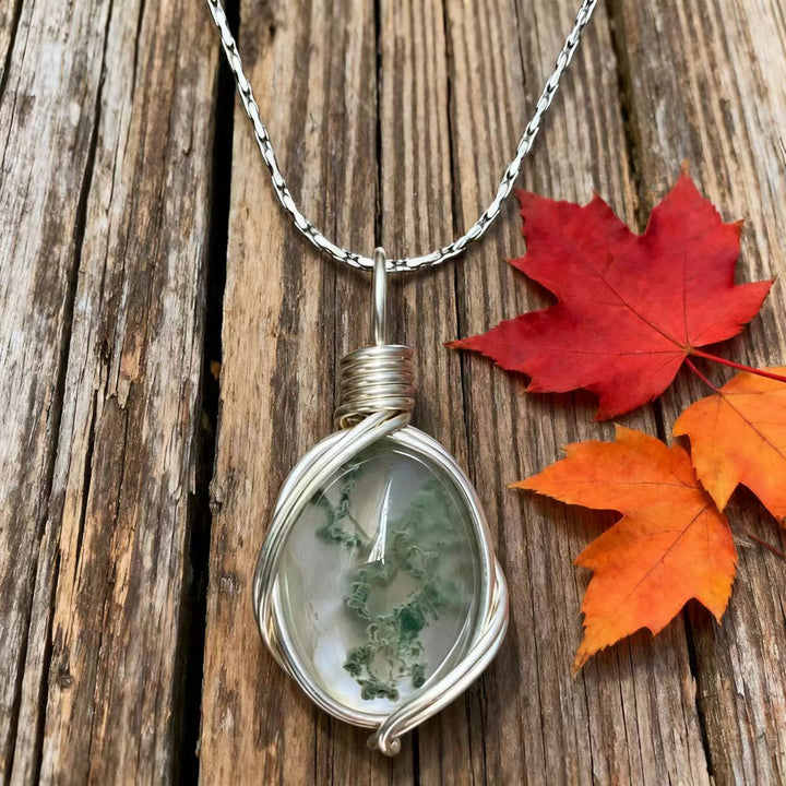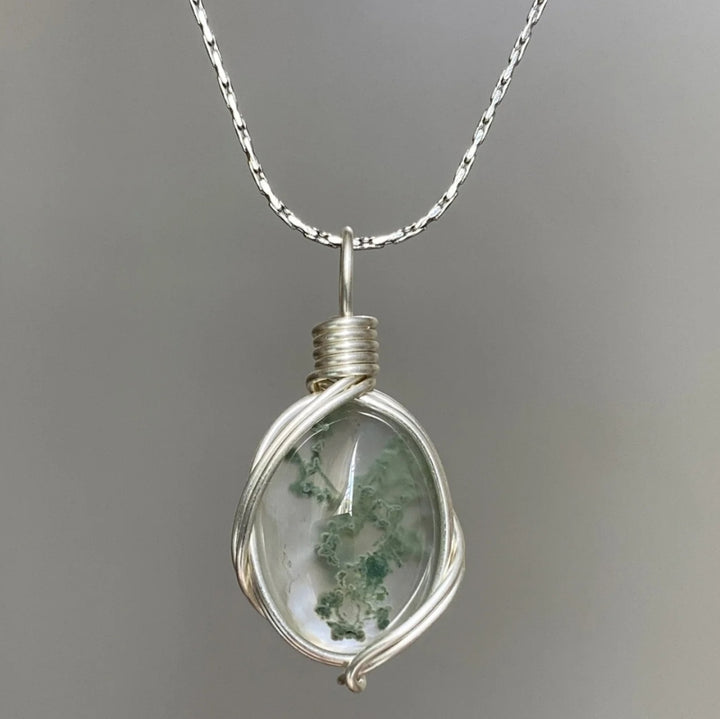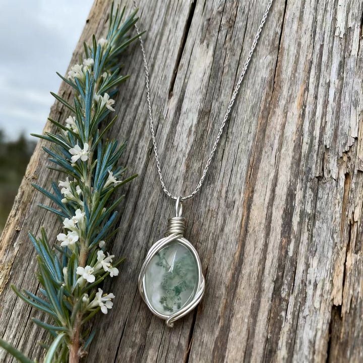 Artisan Handmade: Each necklace is meticulously crafted by hand. The process of wrapping the silver wire around the moss agate pendant showcases exceptional craftsmanship and attention to detail, ensuring that every piece is truly one-of-a-kind.