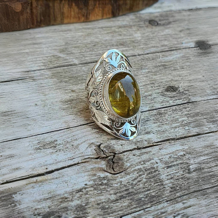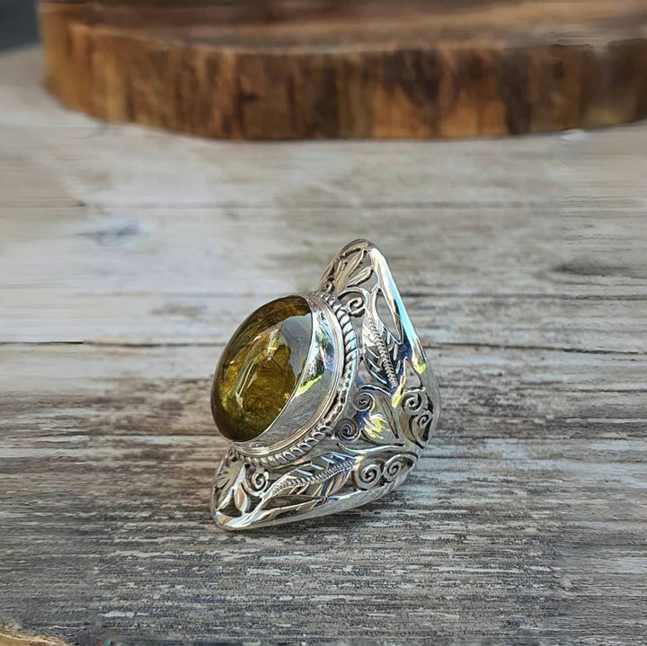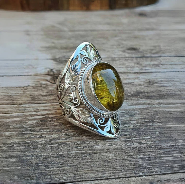 Set with natural gemstones: Oval natural gemstones (specific stone types, such as yellow rutilated quartz, can be added) feature a warm hue and unique texture. Each gemstone, due to its natural properties, exhibits its own unique pattern and hue, giving the ring a unique feel.