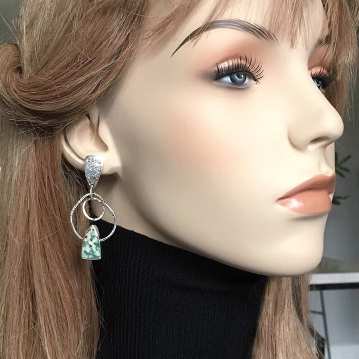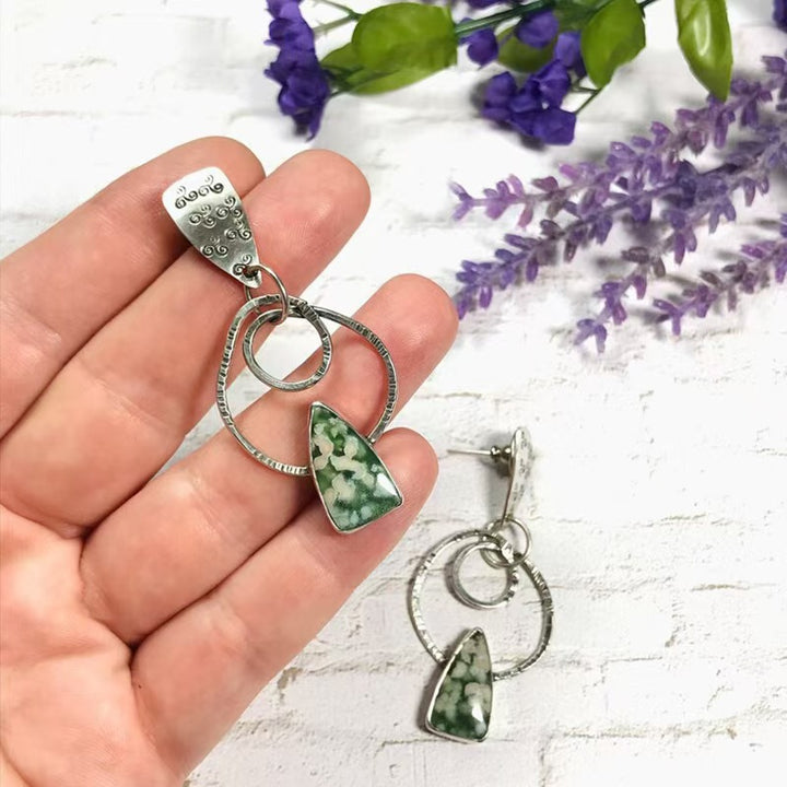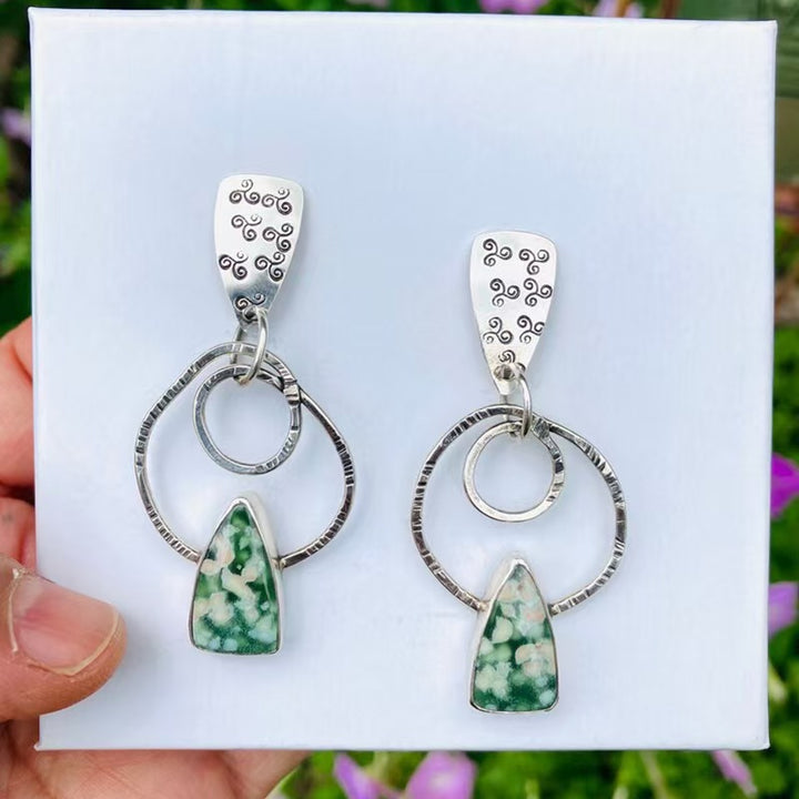 Step into the world of timeless elegance with these exquisitely handmade silver vintage earrings, featuring beautiful natural stone accents. Each earring showcases a unique design, with intricate silver detailing and a stunning natural stone that displays a captivating mix of colors and patterns. The craftsmanship is evident in the textured silver components and the precise setting of the natural stone, creating a piece that's both classic and full of vintage charm. Perfect for women who appreciate unique, handcrafted jewelry, these earrings are ideal for adding a touch of vintage sophistication to any outfit. Whether you're heading to a special event, a casual gathering, or simply want to elevate your daily look, these earrings are sure to become a beloved accessory.