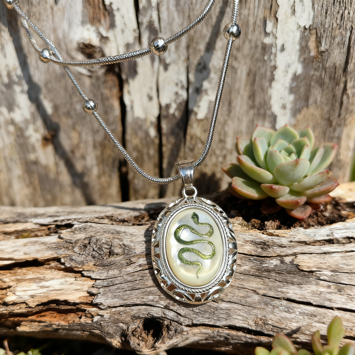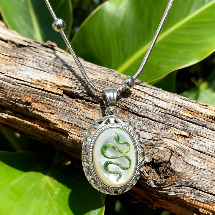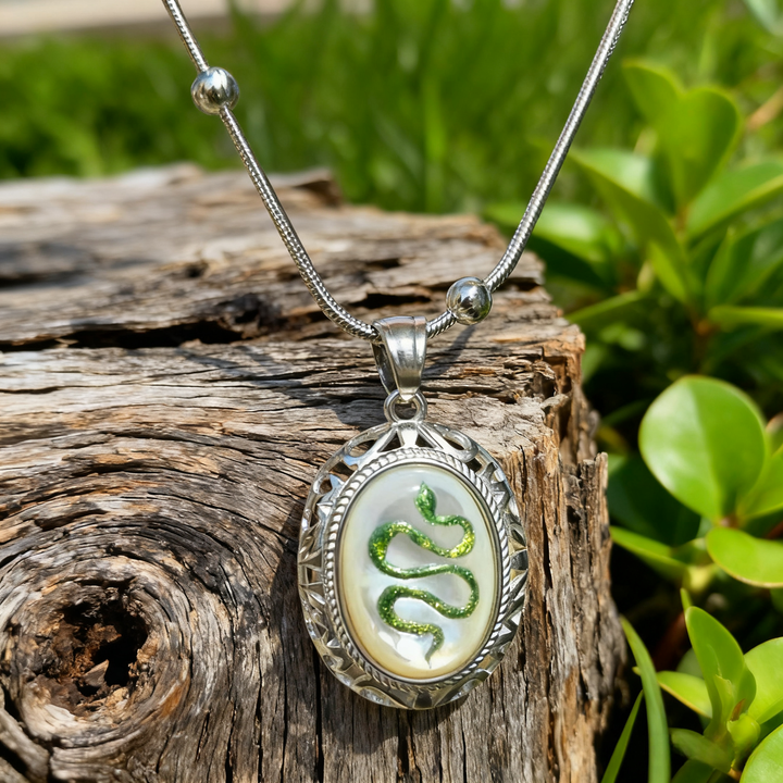 Luminous Mother - of - Pearl Pendant: The pendant features genuine mother - of - pearl, known for its natural iridescence and pearly sheen. The hand - painted snake design adds a vibrant, eye - catching element, merging organic beauty with creative artistry.