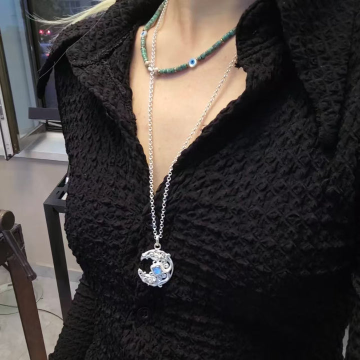 Elevate your style with this exquisitely handmade necklace, a perfect blend of artistry and elegance. Featuring a durable titanium steel chain, it showcases a stunning crescent - shaped pendant crafted from 925 silver, adorned with a shimmering moonstone at its center. The intricate, hand - forged details of the silver crescent add a touch of vintage charm, while the moonstone's ethereal glow brings a magical allure. Ideal for women who love unique, artisanal jewelry, this necklace is a wonderful accessory to enhance any outfit, whether you're attending a special event, a casual gathering, or simply going about your daily routine.