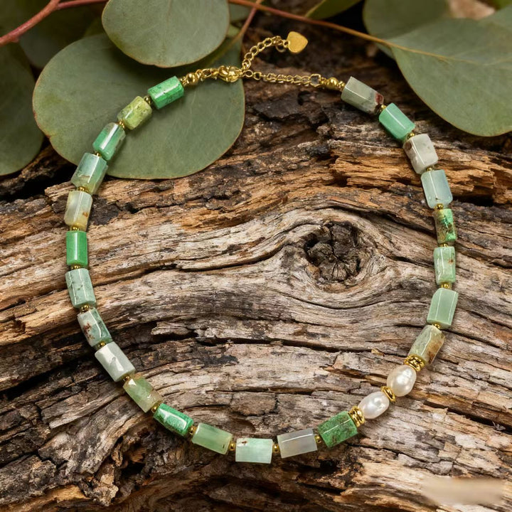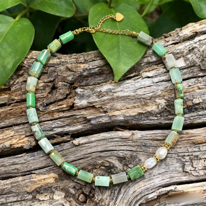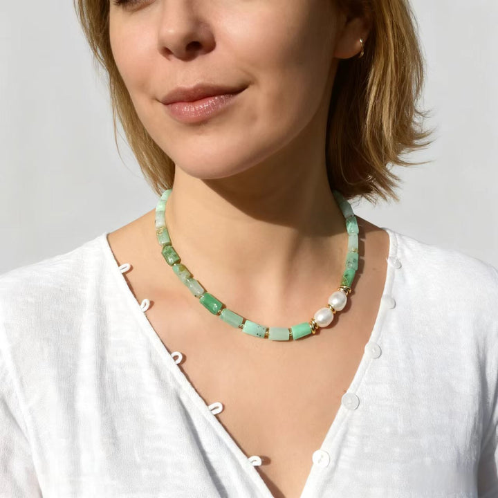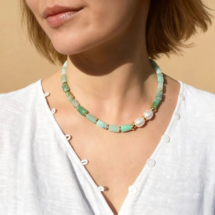 Elevate your style with this exquisitely handmade necklace that seamlessly blends natural beauty and craftsmanship. Featuring a harmonious combination of Amazonite, lustrous pearls, and other natural stones, all elegantly strung together with a durable titanium steel chain and extender. Ideal for American women who cherish unique, artisanal jewelry, this necklace is a perfect accessory for adding a touch of earthy elegance to any outfit. Whether you're dressing up for a special occasion or enhancing your everyday look, it's sure to become a standout piece in your collection.