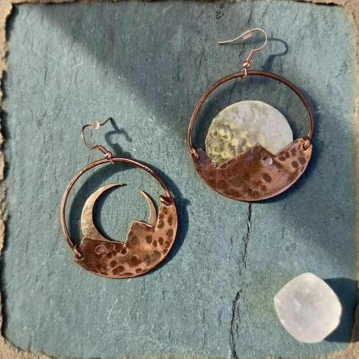 Handmade Vintage Bohemian Earrings for Women - Copper & Silver Moon and Mountain Design