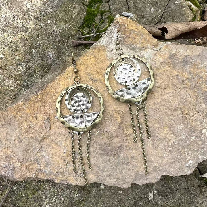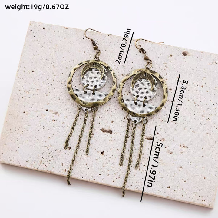 Handmade Vintage Bohemian Earrings for Women - Copper & Silver Moon Design with Chains