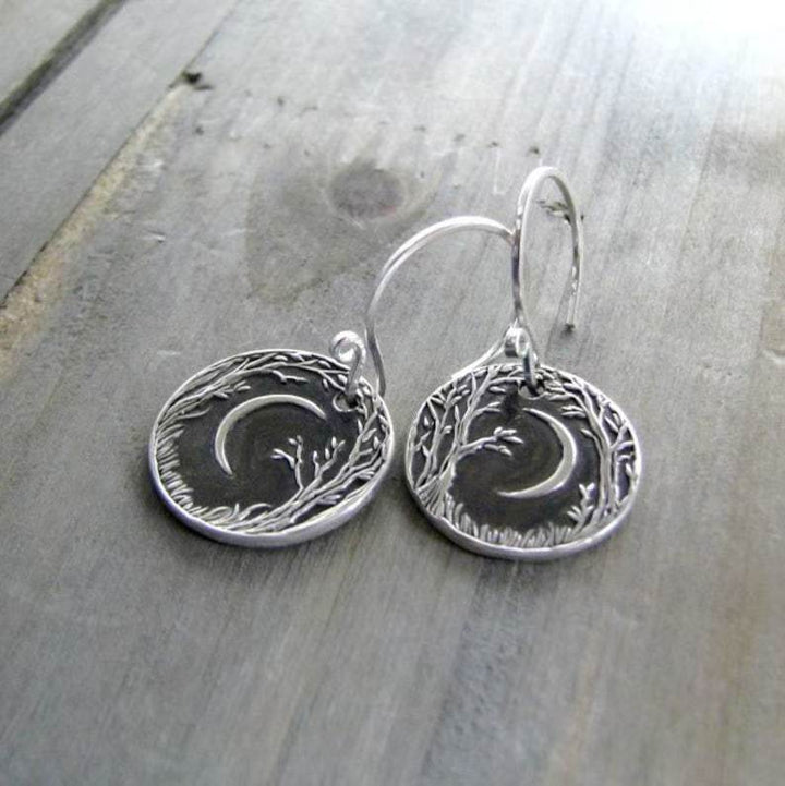 Handmade Vintage Bohemian Silver Earrings - Crescent Moon & Tree Design