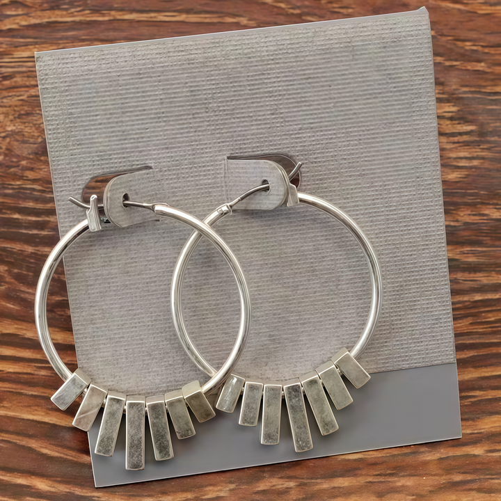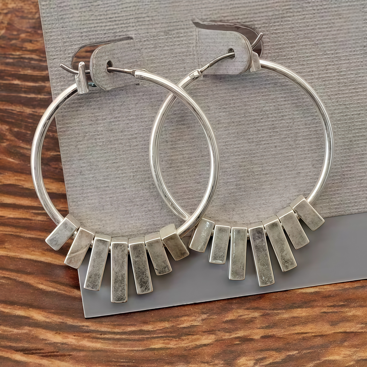 Step into the allure of vintage fashion with these exquisitely handmade silver hoop earrings. Each earring features a classic hoop design crafted from high - quality silver, adorned with carefully arranged geometric accents along the bottom. The artisanal craftsmanship is evident in the precise detailing and the timeless, retro aesthetic they embody. Perfect for women who appreciate unique, handcrafted jewelry, these earrings are ideal for adding a touch of vintage charm to any outfit. Whether you're dressing up for a special occasion or elevating your everyday look, these earrings are sure to become a cherished accessory.