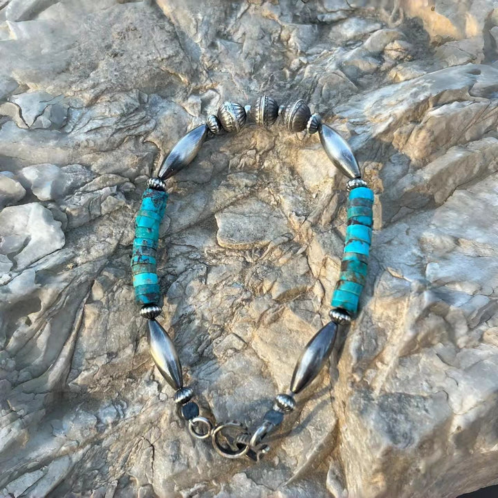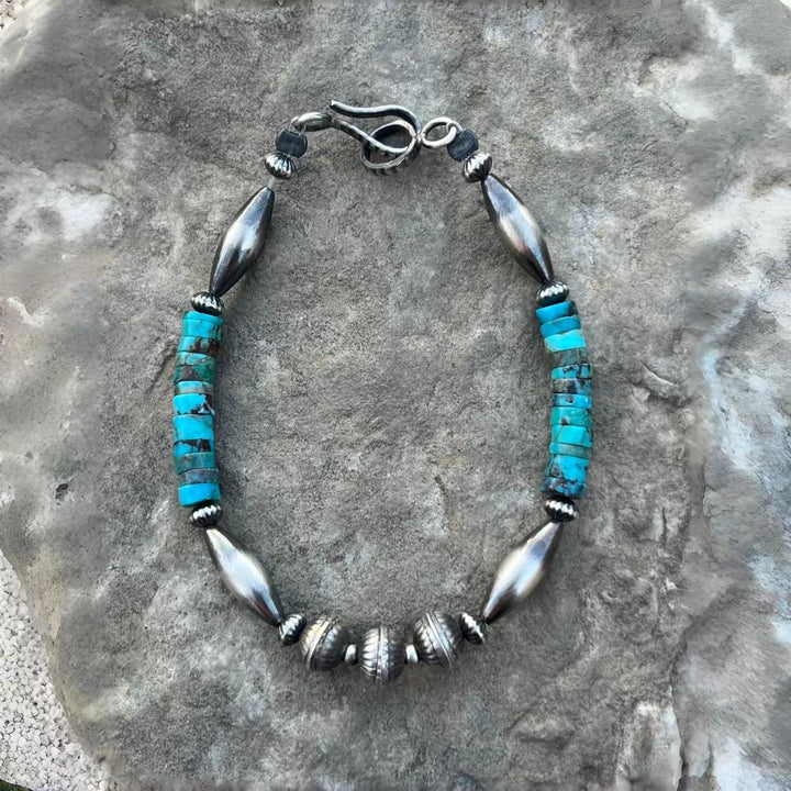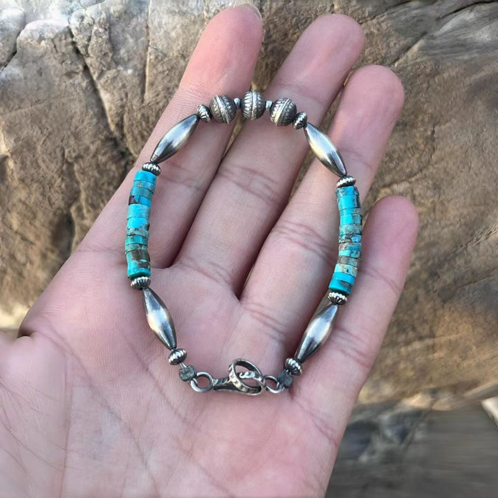 Elevate your jewelry collection with this exquisite Navajo-style handmade bracelet. Featuring stunning Kingman turquoise and meticulously crafted sterling silver beads, this piece embodies the rich heritage and artistry of Native American craftsmanship. Each bead is hand-fashioned, ensuring you own a truly unique accessory that reflects the timeless beauty and cultural significance of Navajo jewelry. Perfect for adding a touch of vintage charm and Southwest flair to any outfit, this bracelet is a must-have for lovers of authentic, handcrafted jewelry.