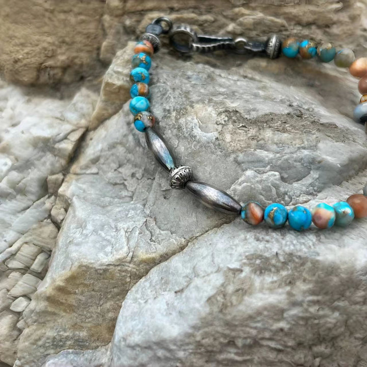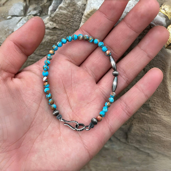 Elevate your jewelry collection with this exquisite Navajo style handmade bracelet! Crafted with care, it features stunning Mohave turquoise beads, renowned for their vibrant blue hues and unique patterns, paired with intricately designed sterling silver beads. Reflecting the rich heritage and artistry of Navajo craftsmanship, this bracelet is not just an accessory but a piece of wearable art. Perfect for adding a touch of Southwest charm to your everyday look or as a special gift for lovers of Native American-inspired jewelry.