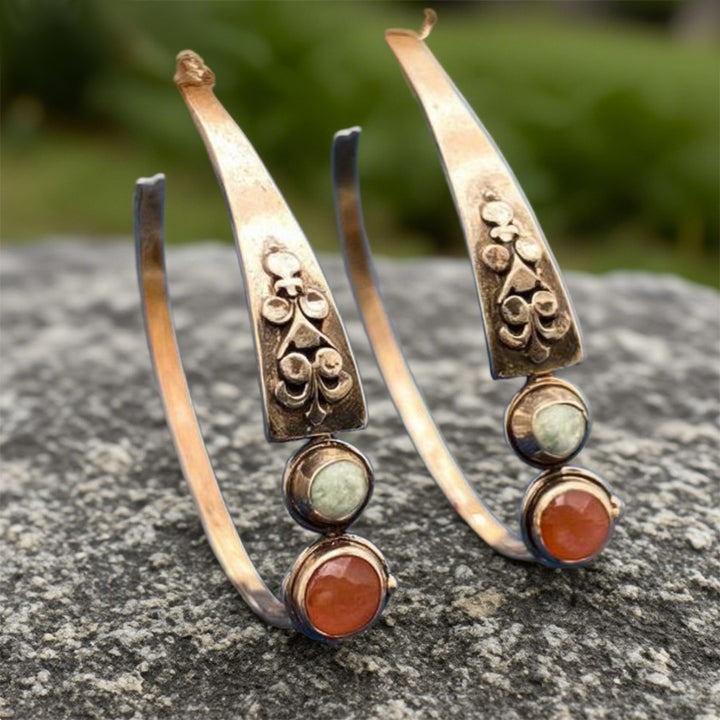 Rustic Gemstone Hoop Earrings β Vintage Bronze Floral Design with Dual Stone Accents