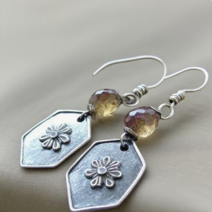 Vintage Daisy Shield Earrings β Hexagon Floral Drops with Faceted Crystal Beads