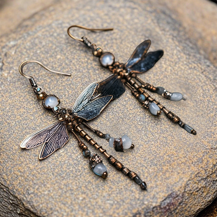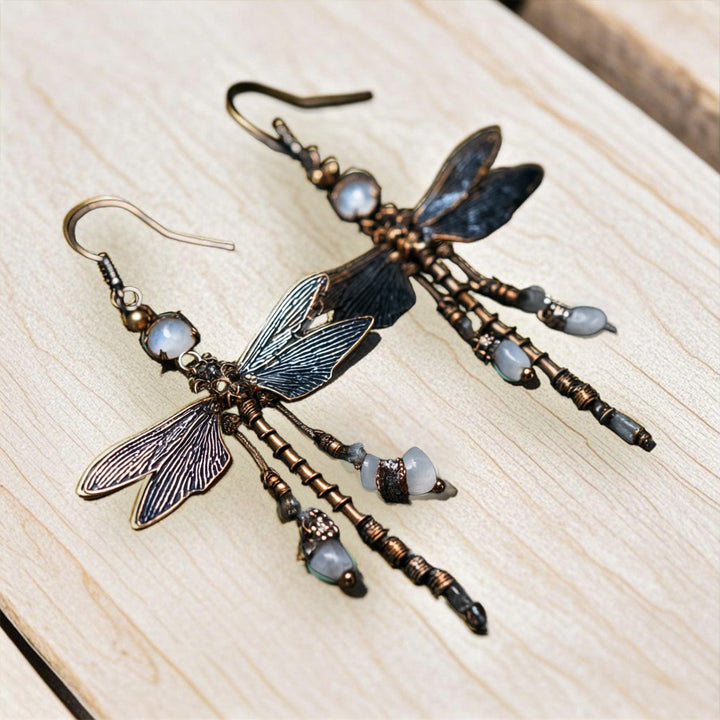 Vintage Dragonfly Dangle Earrings with Beads and Patina Wings