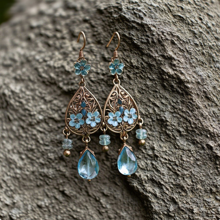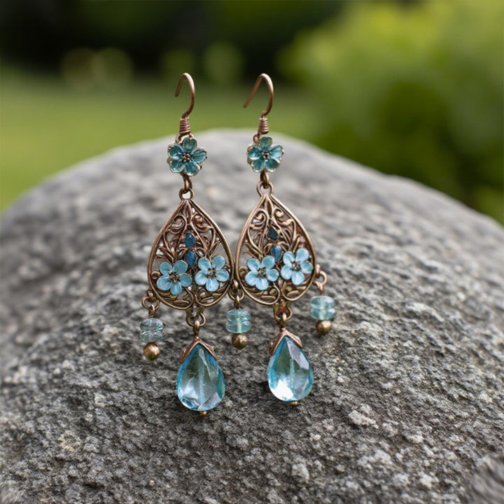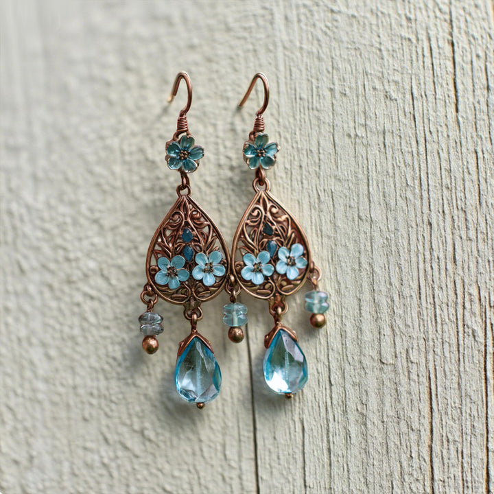 Vintage Floral Chandelier Earrings – Blue Crystal Drop with Bronze Filigree